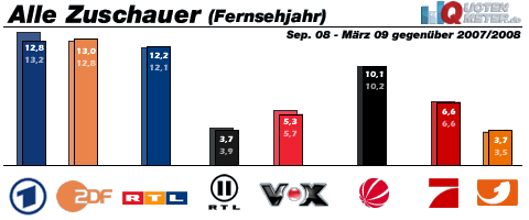 ProSieben liegt nach sieben Monaten des Fernsehjahres bislang bei einem Marktanteil von 6,6 Prozent beim Gesamtpublikum und hat damit 1,3 Prozentpunkte Vorsprung auf den Verfolger VOX, der sich offensichtlich stabilisiert hat. Den letzten Platz teilen sich momentan RTL II und kabel eins, die insgesamt jeweils 3,7 Prozent Marktanteil erzielen. Bestätigt sich jedoch der Trend der letzten Wochen, könnte RTL II am Ende des Fernsehjahres noch die Nase vorne haben.