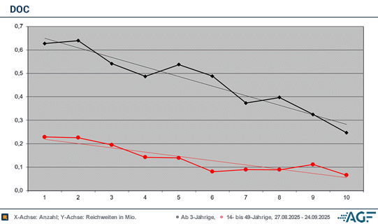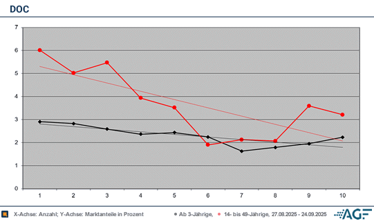 Mitte September zählte «Doc» um 20.15 Uhr nur noch 0,54 Millionen Fernsehzuschauer, der Marktanteil lag nur noch bei 2,4 Prozent. Wie schon in der Vorwoche wurden lediglich 0,14 Millionen generiert, das bedeutete unzureichende 3,4 Prozent. Eine Stunde später wurde das Ergebnis mit 0,49 Millionen Zusehern und 2,2 Prozent noch einmal unterboten. Bei den Werberelevanten wurden nur noch 0,08 Millionen gezählt, das führte zu 1,9 Prozent Marktanteil.