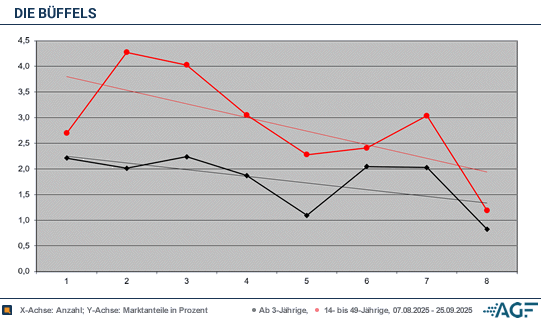 Schaut man sich die Zahlen vom Donnerstag, den 7. August 2025 um 20.15 Uhr, an, dann kann man von einem wahrlich ungünstigen Start sprechen. Bloß 0,07 Millionen jüngere Zuschaltende sorgten für einen Anteil von völlig unterirdischen 2,7 Prozent. Ähnlich desolat war die Performance bei den Älteren, welche zu 2,2 Prozent (0,31 Millionen) dabei waren.