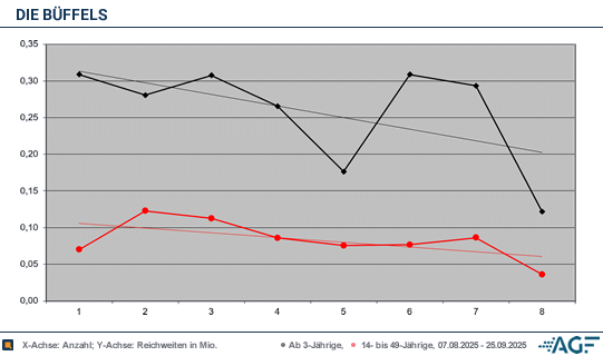 Eine Woche später stand ein weiterer Lackmustest an. Tatsächlich verbesserte sich der Zielgruppen-Anteil auf immerhin mäßige 4,3 Prozent, weil 0,12 Millionen aus dieser Alterskategorie Neugier hatten. Insgesamt ging es hingegen weiter runter auf 0,28 Millionen und 2,0 Prozent runter. In der Folge-Woche verblieb die Resonanz ziemlich konstant bei noch annehmbaren Größenordnungen über vier Prozent bei den 14-49-jährigen.
