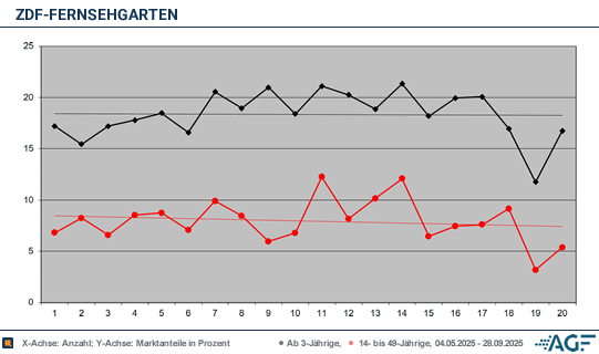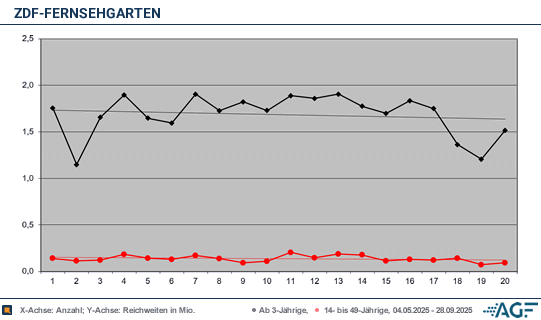 Im Durchschnitt erzielte die diesjährige «Fernsehgarten»-Saison 1,68 Millionen Zuschauer und einen Marktanteil von 18,3 Prozent. Im Vorjahr waren es 1,58 Millionen und 16,5 Prozent. Bei den jungen Zuschauern wurden nun 0,14 Millionen (7,9 Prozent) gemessen – etwas weniger als 2024, als 0,17 Millionen und 8,6 Prozent erzielt wurden.