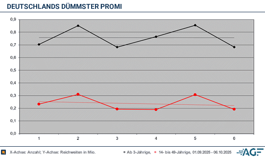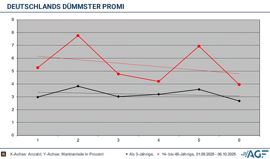 Schaut man auf die Zahlen vom Auftakt, den 1. September 2025 um 20.15 Uhr, war das bereits zu Beginn der Fall. Bloß 0,23 Millionen jüngere Zuschaltende sorgten für einen Anteil von enttäuschend tristen 5,3 Prozent. Ähnlich ernüchternd war die Performance bei den Älteren, welche zu 3,0 Prozent (0,70 Millionen) dabei waren. Eine Woche später stand ein weiterer Stresstest an. Tatsächlich verbesserte sich der Zielgruppen-Anteil auf immerhin mäßige 7,8 Prozent, weil gesteigerte 0,31 Millionen aus dieser Alterskategorie Neugier hatten. Insgesamt ging es ebenfalls in die richtige Richtung, aber bei 0,85 Millionen und 3,8 Prozent zu zaghaft. Konnte der kleine Lichtblick in der Zielgruppe dann vertieft werden?