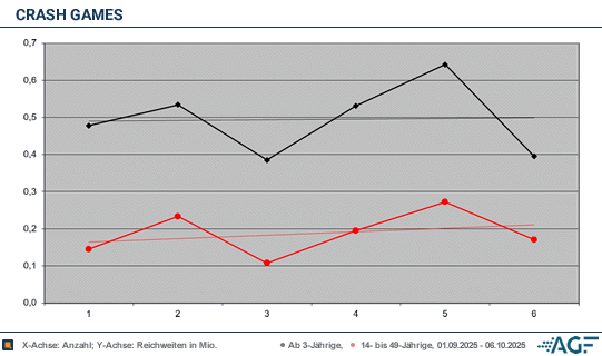 Mit der vorletzten Ausgabe gelang es dem Trash-Parcours dann überraschender Weise nochmal, ein kleines Aufmucken zu erzeugen. Eine ein Stück erhöhte Flughöhe von immerhin halbwegs annehmbaren 6,5 Prozent der Jüngeren ließ sich ableiten, weil ihr Interesse auf 0,27 Millionen wuchs. Auf niedrigerem Level bildete sich jene Aufwärtsbewegung auch am Gesamtmarkt ab, wo erstmals mit exakt 3,0 Prozent die Drei-Prozent-Hürde genommen werden konnte - 0,64 Millionen waren dabei.