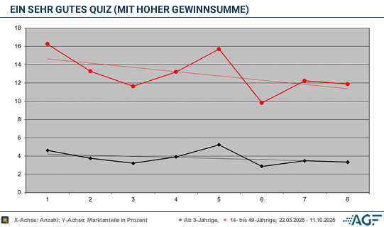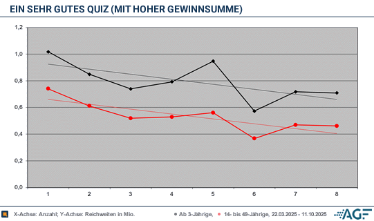 Die zweite Staffel von «Ein sehr gutes Quiz (mit hoher Gewinnsumme)» zeigt deutliche Abnutzungserscheinungen. In der ersten Runde waren 0,85 Millionen Menschen dabei, jetzt wurden nur noch 0,74 Millionen Zuschauer ab drei Jahren gemessen. Der Marktanteil beim Gesamtpublikum schrumpfte von 3,9 auf 3,7 Prozent. Bei den Werberelevanten sank die Teilnahme von 0,60 auf 0,46 Millionen. Dennoch sollte eine mögliche dritte Staffel nicht wirklich unerfolgreicher laufen: Es wurden 12,4 Prozent Marktanteil eingefahren, im Frühjahr waren es noch 13,6 Prozent.
