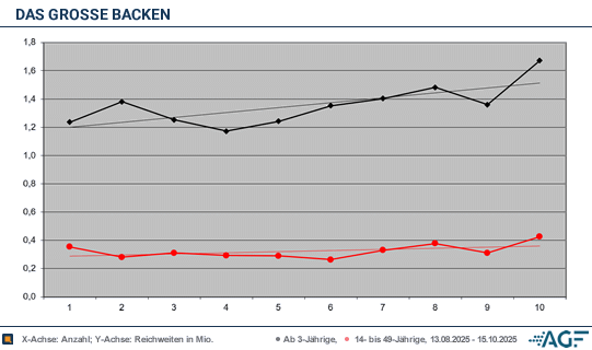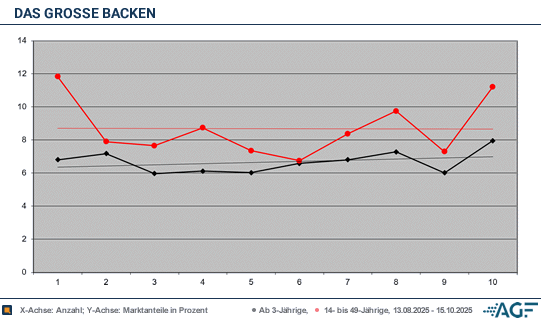 Mit den übrigen Episoden stieg das Interesse allerdings wieder an: 1,40, 1,48 und 1,36 Millionen Zuschauer ab drei Jahren wurden gemessen. Bei den jungen Menschen ging es mit 0,33, 0,38 und 0,31 Millionen aufwärts; die Marktanteile kletterten von 8,4 über 9,7 zu 7,3 Prozent. Das Staffelfinale am 15. Oktober ließen sich 1,67 Millionen Zuschauer ab drei Jahren nicht entgehen, Jacqueline aus Binningen begeisterte acht Prozent der Zuschauer. Die Kindergartenlehrperson gewann die Show und verbuchte 0,43 Millionen, was zu 11,2 Prozent Marktanteil führte.Die 13. «Das große Backen»-Staffel erreichte 1,35 Millionen Zuschauer ab drei Jahren, im Vorjahr wurden noch 1,41 Millionen gemessen. Jetzt wurde ein Marktanteil von 6,7 Prozent verbucht. Im Vorjahr sorgten 0,44 Millionen für 9,7 Prozent, allerdings wurden in der Zielgruppe nur noch 0,32 Millionen geholt, die für 8,7 Prozent Marktanteil standen.