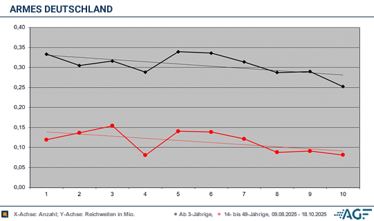 Auf diesem ärgerlichen Niveau verlief schließlich der ganze bisherige Oktober weiter, denn auch in der Zeit danach verblieb man bei krisenhaften 2,3 Prozent bei um die 0,09 Millionen. Am Gesamtmarkt hielt sich das alles übrigens meistens zwischen Reichweiten von 0,20 und 0,30 Millionen auf bei Anteilen um läppische ein Prozent.