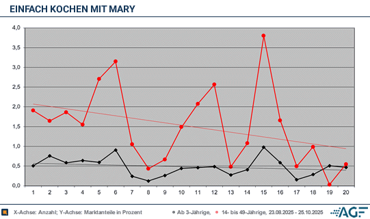 Mit dem Start in den September veränderten sich die Werte: „Heute gibt’s Fleisch“ erreichte am 6. September 0,03 Millionen Zuschauer, wovon alle zu den Umworbenen gehörten. Das führte dazu, dass ein Marktanteil von starken 2,7 Prozent erzielt wurde. Danach ging es mit „Kreative Hähnchenrezepte“ weiter. 0,06 Millionen Fernsehzuschauer bedeuteten 0,9 Prozent Marktanteil. Bei den Umworbenen wurden 0,04 Millionen gemessen, das führte zu 3,1 Prozent.