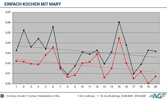 Sieben Tage später schalteten nur noch 0,01 sowie 0,02 Millionen Menschen ein; bei den Umworbenen wurden jeweils lediglich 0,01 Millionen gemessen. Das hatte natürlich zur Folge, dass die Marktanteile gegen null tendierten und mit 0,4 sowie 0,7 Prozent äußerst schwach ausfielen. Doch am 20. September waren wieder bessere 0,7 und 1,5 Prozent möglich, Ende September wurden sogar wieder 2,1 und 2,6 Prozent Marktanteil eingefahren.