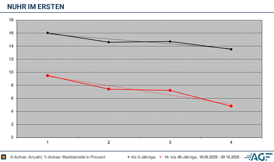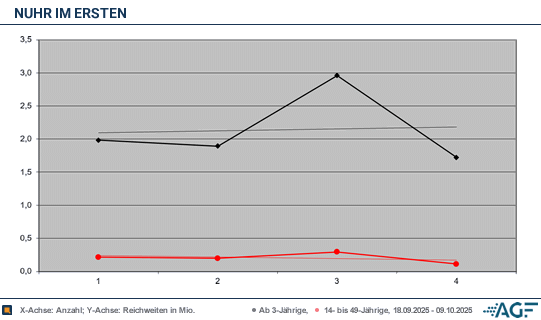 Eine Woche später stand der Test an, ob diese Flughöhe gehalten werden konnte. Tatsächlich fiel der Marktanteil am Gesamtmarkt etwas auf 14,6 Prozent, weil ein bisschen verringerte 1,89 Millionen aus dieser Alterskategorie Interesse hatten. Trotzdem ist das weiter eine Dimension, die klar über Senderschnitt lag. Bezüglich der 14-49-Jährigen ließ der Anteil gleichfalls nach auf mittlere 7,4 Prozent (0,20 Millionen). Waren sieben Tage darauf vielleicht wieder ein paar Steigerungen drin?