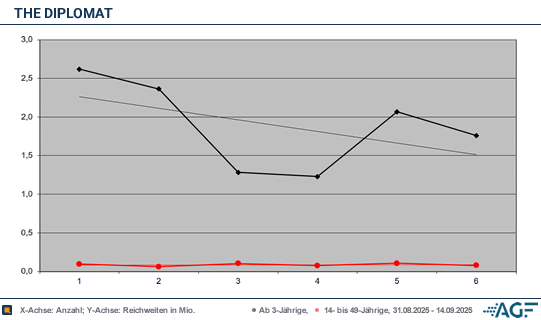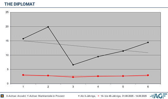 Noch weiter hochschrauben ließ sich das Ganze dann aber nicht mehr, denn in der Folge-Woche krachte das Interesse extrem nach unten. Von den über 50-jährigen war plötzlich bloß noch schwache 6,6 Prozent zu 12,8 Millionen Einschaltende. Anschließend pendelte man sich zumindest auf etwas verbesserte 9,5 Prozent ein, die trotzdem deutlich unter Senderschnitt lagen. Diese gedrosselte Flughöhe zeigte sich auch bezüglich der 14-49-jährigen, welche nur 2,3 und 2,6 Prozent zustande brachten. Mit-bedingt wurde der ungewöhnlich krasse Einbruch beim Gesamtpublikum wohl auch von der deutschen Fußball-Nationalmannschaft der Männer, die an diesem Abend bei RTL gegen Nordirland spielte und damit über acht Millionen zog.