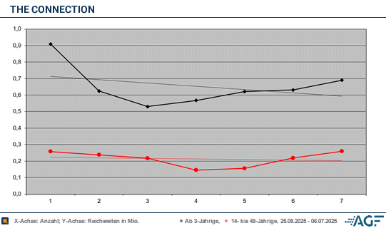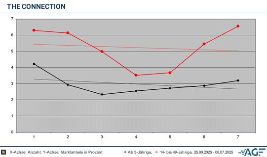 Die letzte Folge, die am 6. November ausgestrahlt wurde, erreichte 0,69 Millionen Fernsehzuschauer. Die Quote steigerte sich auf 3,2 Prozent. Bei den jungen Erwachsenen waren 0,26 Millionen dabei, sodass man wieder auf dem Ausgangswert landete. Der Marktanteil lag bei 6,6 Prozent. Im Durchschnitt erreichte die Fernsehshow «The Connection» 0,65 Millionen Zuschauer ab drei Jahren und holte drei Prozent Marktanteil. In der Zielgruppe wurden 0,21 Millionen Zusehende verbucht, der Marktanteil wurde auf 5,2 Prozent beziffert. Obwohl die Werte zuletzt wieder leicht anzogen, sind die bisherigen Ergebnisse zu schwach. Sat.1 sollte sich ein spannenderes Quiz sichern – vor allem, da man mit «The Floor» und anderen Formaten bereits ein deutlich stärkeres Portfolio im Programm hat.