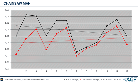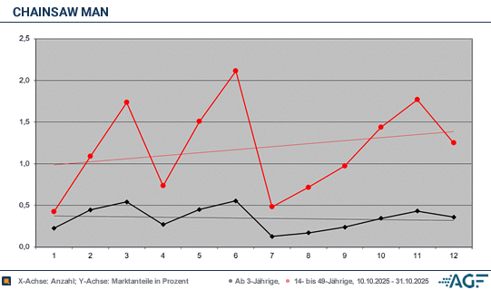 Die letzten drei Folgen liefen an Halloween. Am 31. Oktober schalteten zu Beginn immerhin 0,07 Millionen ein, die zweite Folge erreichte 0,08 Millionen. Mit 0,06 Millionen Umworbenen kam die erste Folge auf 1,4 Prozent, die zweite Geschichte sorgte mit 0,07 Millionen jungen Menschen für 1,8 Prozent. Jetzt kommt man an die Grenzen der Quotenmessung: Haben wirklich zahlreiche Fans die letzte Folge nicht sehen wollen? 0,05 Millionen Zuschauer waren dabei, 0,04 Millionen gehörten zur Zielgruppe, der Marktanteil sank auf 1,2 Prozent.«Chainsaw Man» erreichte bei ProSieben Maxx im Durchschnitt 0,06 Millionen Zuschauer und fuhr damit enttäuschende 0,3 Prozent Marktanteil ein. Bei den jungen Erwachsenen wurden allerdings 0,04 Millionen gemessen, sodass ProSieben Maxx auf mittelprächtige 1,2 Prozent kam.