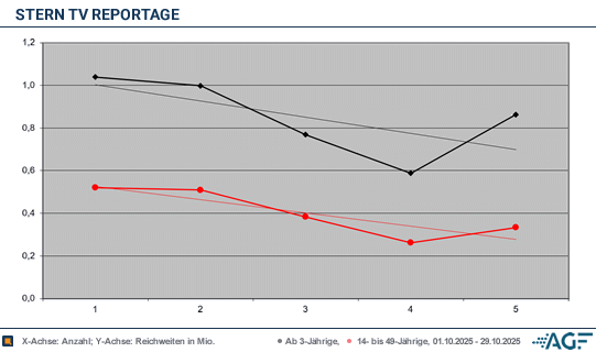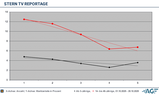 Dass man sich damit noch wirklich glückschlich schätzen konnte und die Reportagen-Marke kein absoluter Selbstläufer ist, stellte sich sieben Tage später heraus. "Der Fastfood Hype" mobilisierte nämlich bloß 0,26 Millionen Zielgruppen-Leute bei mittelprächtigen 6,4 Prozent. Insgesamt dümpelte man gar in richtig haarigen Gefilden in Höhe 2,6 Prozent (0,59 Millionen) herum. Die «stern TV-Reportage – Mein Super Markt» zum Abschluss am 29. Oktober konnte sich auch nicht mehr aus dem Loch befreien und stieg nur leicht auf 6,8 Prozent wegen 0,33 Millionen Jüngeren an.
