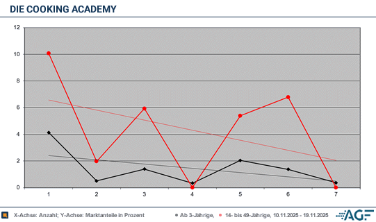 Zum Wochenstart erreichte «Die Cooking Academy» bei der roten Sieben 0,04 Millionen Fernsehzuschauer ab drei Jahren, der Marktanteil bewegte sich bei 1,4 Prozent. Bei den jungen Erwachsenen wurden 0,04 Millionen Zuschauer erreicht, der Marktanteil lag bei 6,8 Prozent. Die Episode vom Dienstag verbuchte dann schließlich 0,01 Millionen Zuschauer und 0,4 Prozent. Erneut wurden 0,00 Millionen Zuseher erreicht, der Marktanteil lag bei 0,0 Prozent.