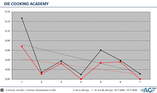 Doch am Dienstag sollte es bereits zu Problemen kommen. Die Episode zählte nur noch 0,01 Millionen Fernsehzuschauer ab drei Jahren, wovon alle zu den 14- bis 49-Jährigen gehörten. Beim Gesamtpublikum wurden 0,5 Prozent Marktanteil generiert, bei den Umworbenen waren zwei Prozent möglich. Am Mittwoch war die Gesamtreichweite vierfach so hoch, der Marktanteil verbesserte sich auf 1,4 Prozent. «Die Cooking Academy» sorgte für 0,03 Millionen junge Fernsehzuschauer, der Marktanteil bewegte sich bei 5,9 Prozent.