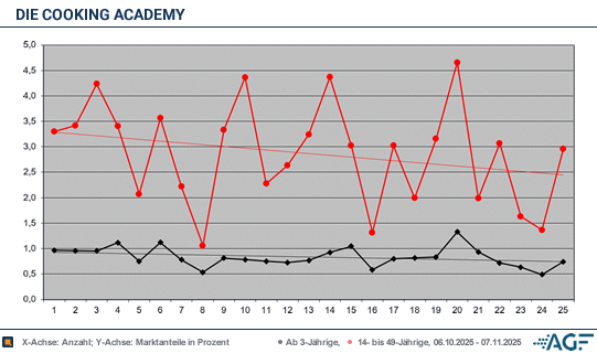 Und so setzte sich dieses beispiellose Siechtum weiter fort: Vereinzelte Zahlen um zwei und drei Prozent müssen vielsagender Weise bereits als Ausreißer gefasst werden, die wieder von Ameisen-Dimensionen durchbrochen wurden. So geschehen erneut am Montag, den 27. Oktober, der wieder auf brutal bittere 1,3 Prozent fiel bei 0,03 Millionen. Dieses tieftraurige Spiel setzte sich nur zwei Tage später fort mit 2,0 Prozent durch 0,05 Millionen – kein Wunder, dass am Ende der Woche die Absetzung bekanntgegeben wurde.