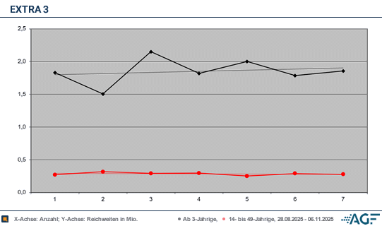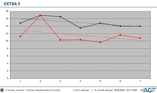 Aus eben dieser zurückgemeldet hat sich «extra 3» schließlich am 28. August. Große Eingewöhnungszeit schien nicht von Nöten, denn zur Wiederkehr waren gleich mal schöne Dimensionen von 11,2 der Jüngeren (0,27 Millionen) wie 14,8 Prozent der überwiegend über 50-jährigen drin. Noch mehr hochschrauben konnte Ehring das Interesse sieben Tage später: Erhöhte und letztlich klasse 16,9 Prozent der Jüngeren wiesen die Daten aus. Insgesamt ebenfalls gestärkte 16,9 Prozent standen auf dem Tacho.