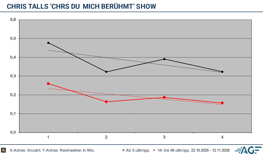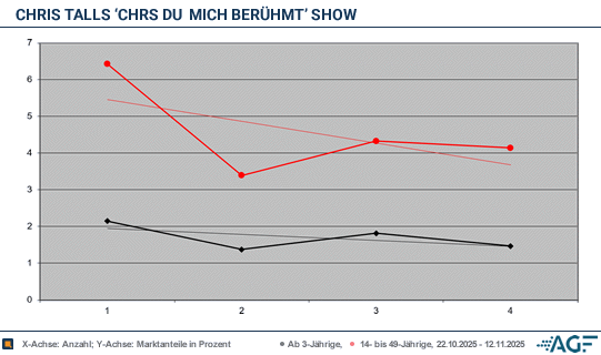 Alles in allem holte die erste (und definitiv auch einzige) Staffel von «Chris Talls "Chris du mich berühmt" Show» im Mittel lediglich 4,6 Prozent in der Zielgruppe (0,19 Millionen). Noch schlechter stellt sich der Schnitt insgesamt dar, welcher sich auf mikroskopische 1,7 Prozent (0,38 Millionen) belief. Zusammengefasst sind diese Zahlen eine völlige Bankrotterklärung, die ProSieben äußert peinlich dastehen lassen. Einmal mehr stellte der "We Love to Entertain You"-Kanal unter Beweis, dass er abgesehen vom Florida getriebenen Joko/Klaas-Kosmos seinen Riecher für zündende Show-Dramaturgien verloren zu haben scheint...