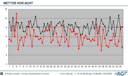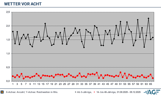 Unter dem Strich stehen verhaltene 8,2 Prozent am Gesamtmarkt sowie noch schlechtere 5,9 Prozent bei den Jüngern. Die mittleren Reichweiten dabei beliefen sich auf 1,65 wie 0,19 Millionen. Letztlich ist der Wetter-Vorklapp vor der «Tagessschau» damit kein Erfolg und fährt größtenteils zähe Zahlen ein. Lichtblicke tauchen immer mal vereinzelt auf bei den Jüngeren um acht Prozent sowie bei den Gesamtzuschauenden um zehn Prozent. Hierbei ist auffällig, dass die zweistelligen Dimensionen mit über zwei Millionen Interessierten im Schnitt häufiger am Montag erhoben wurden, was darauf hindeuten könnte, dass sich dort vermehrt Leute einen Überblick über die Wochen-Vorhersagen verschaffen. Dieser Effekt lässt sich jedoch bei weitem nicht in jeder Woche beobachten.