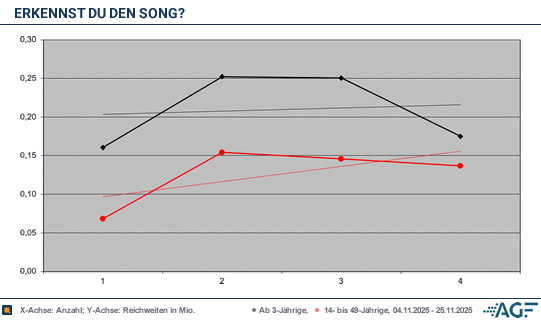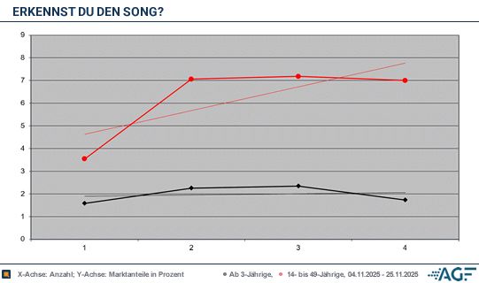 Einen wirklichen Durchbruch konnte schließlich auch die Schlussfolge am 25. November nicht mehr besorgen. Vielmehr verblieb die Zielgruppen-Resonanz bei ähnlichen 0,14 Millionen und 7,0 Prozent. Mit Blick auf den Gesamtmarkt ereignete sich ein merklicherer Abfall, der sich mit furchtbaren 1,7 Prozent zu 0,17 Millionen äußerte.Alles in allem holte die jüngste Staffel von «Erkennst DU den Song? LIVE» im Mittel gerade noch verschmerzbare 6,2 Prozent in der Zielgruppe (0,13 Millionen). Noch schlechter stellt sich der Schnitt insgesamt dar, welcher sich auf mickrige 2,0 Prozent (0,17 Millionen) belief. Zusammengefasst bringt die juvenil ausgerichtete Sendung den Kanal damit nicht sonderlich weiter, wenngleich andere Produktionen zumindest bezüglich der 14-49-jährigen teilweise noch eine Ecke schlechter liefen.