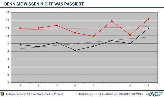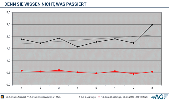 Die zweite Folge, die nur sieben Tage später ausgestrahlt wurde, erreichte 1,72 Millionen Zuschauer, der Marktanteil sank auf 9,2 Prozent. Unter den jungen Erwachsenen wurden 0,55 Millionen gezählt, der Marktanteil lag bei guten 14,0 Prozent. Nach zwei Wochen Pause ging es mit der dritten Folge in diesem Block weiter, die wieder 1,93 Millionen Zuschauer zählte und auf 10,2 Prozent kam. In der Zielgruppe wurden sogar starke 0,60 Millionen Zuschauer erreicht – das wird man auch mit dem Finale im Dezember 2025 nicht mehr übertreffen. Der Marktanteil lag bei 14,7 Prozent.