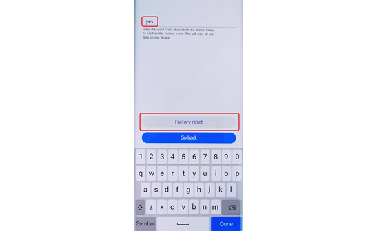 · Bestätigen Sie den Vorgang, indem Sie „yes“ in das Eingabefeld eingeben, und tippen Sie auf „Factory reset“.