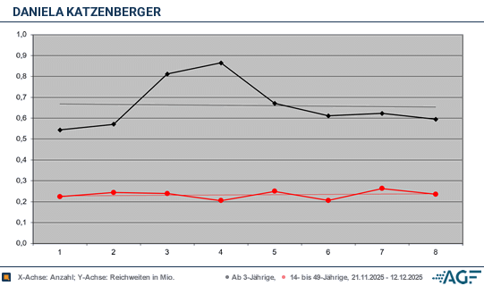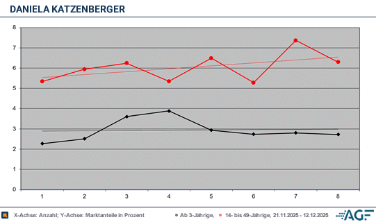 Gestartet war die Runde von «Daniela Katzenberger» am Freitag, 21. November 2025. Die erste Episode konnte sich zunächst nur einen zähen Zielgruppen-Anteil von 5,3 Prozent sichern, weil 0,22 Millionen Fans zuschalteten. Kaum besser war das Feld für die zweite Episode des Abends bestellt, auf dem weiter ernüchternde 5,9 Prozent (0,24 Millionen) erwuchsen. Am Gesamtmarkt wurden nur maximal 2,5 Prozent zu 0,57 Millionen erreicht.