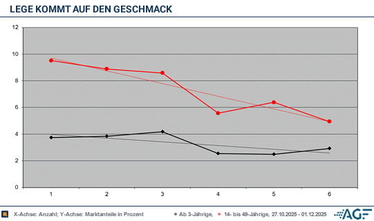 Unter dem Strich verbleiben für aktuelle Runde von «Lege kommt auf den Geschmack» Durchschnittswerte von noch passablen 7,3 Prozent (0,34 Millionen) der Jüngeren wie niedrigeren 3,3 Prozent (0,81 Millionen) am Gesamtmarkt. Für sich genommen kann VOX damit ziemlich zufrieden sein, wenngleich man ob des sehr guten Staffelstarts nach hinten raus doch mehr erwarten hätte können – die Kurve zeigte definitiv in die falsche Richtung. Zu erwähnen ist noch, die hier berichteten finalen Quoten etwas abweichen von den vorläufig gewichteten, welche sogar teilweise 10,0 Prozent auswiesen – während einige Sendungen durch die Nachgewichtungen folglich zulegen, passierte innerhalb Leges Relationen das Gegenteil.