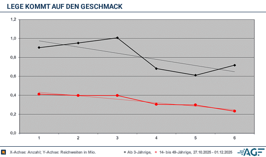 Konstant war das Interesse dann sieben Tage später, als die Zielgruppen-Reichweite auf 0,40 Millionen verblieb. Der Marktanteil, der daraus erwuchs, verringerte sich allerdings moderat auf immer noch klar überdurchschnittliche 8,9 Prozent. In der Woche darauf lief es mit 8,6 Zielgruppen-Prozent mit gleicher Reichweite sehr ähnlich.