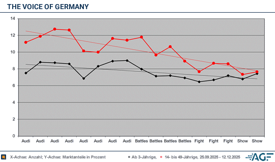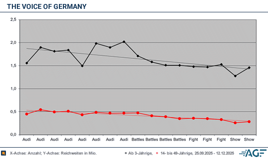 Die Phase der Teamfights machte die Sache im November nicht besser: Es wurden nur noch Reichweiten zwischen 1,47 und 1,53 Millionen verbucht, bei den Umworbenen standen nur noch 0,33 bis 0,36 Millionen der Show beiseite. Die Marktanteile sanken auf 7,7, 8,7 und 8,6 Prozent. Die zwei Live-Shows im Dezember erreichten 0,26 und 0,28 Millionen Zuschauer, das waren die niedrigsten Ergebnisse der Staffel. Die Marktanteile wurden auf 7,3 und 7,6 Prozent beziffert. Insgesamt saßen 1,28 und 1,46 Millionen Menschen vor den Bildschirmen.«The Voice of Germany» hat stark begonnen, aber nach den Battles ist weiterhin die Luft raus. ProSieben und Sat.1 versuchen die Show weiterhin zu strecken. Im Durchschnitt schalteten 1,62 Millionen Menschen ein, das führte zu 7,6 Prozent Marktanteil. Unter den Werberelevanten waren 0,40 Millionen, die 9,9 Prozent Marktanteil mitbrachten.