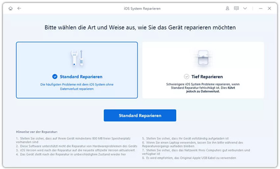 Dann ist meist eine tiefere iPadOS Reparatur erforderlich. Tenorshare Reiboot bieten dafür eine Standard Reparatur, die in vielen Fällen Daten erhält. Eine Tiefenreparatur ist meist nur der letzte Schritt und kann Daten löschen. Prüfen Sie in jedem Fall die angezeigten Hinweise im Programmfenster, bevor Sie fortfahren.
