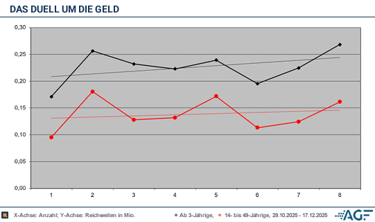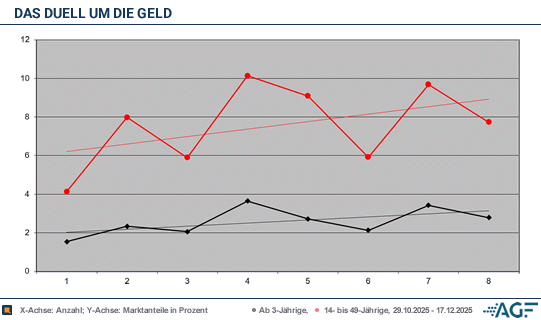 «Das Duell um die Geld» verbuchte im Durchschnitt 0,23 Millionen Zuschauer und hinkte dem Vorjahresergebnis um 0,13 Millionen hinterher. Der Marktanteil blieb mit 2,6 Prozent stabil. Auch in der Zielgruppe sank die Reichweite von 0,22 auf 0,14 Millionen, der Marktanteil blieb mit 7,6 Prozent fast stabil. Vielleicht sollte ProSieben die Show nicht hinter Rohrkrepierern wie Chris Tall platzieren und sie bei Fußball aus der Schussbahn nehmen.