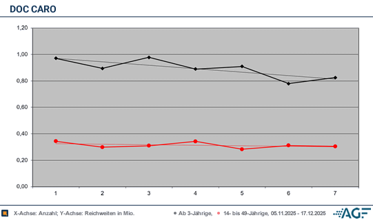Zurück nach Mülheim: 0,91 Millionen Zuschauer sahen die Folge, die auf 3,8 Prozent kam. Bei den jungen Menschen wurden nun 0,28 Millionen verbucht, es wurden 5,7 Prozent eingefahren. Kurios: Am 10. Dezember sackte die Reichweite beim Gesamtpublikum auf 0,78 Millionen ab, der Marktanteil fiel auf 3,3 Prozent. Bei den jungen Erwachsenen wurden allerdings 0,31 Millionen gemessen, sodass der Marktanteil auf 7,2 Prozent wuchs.