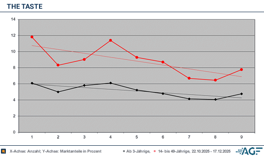 In der zweiten Woche verblieb man hingegen tatsächlich einstellig – daran konnten auch die Nachgewichtungen dieses mal nichts mehr ändern. Wenngleich es durch eben jene trotzdem nochmal von 6,6 Prozent auf passable 8,3 Prozent (0,35 Millionen) aus der Zielgruppe hochging. Geschuldet war dieses Nachlassen wohl auch durch das parallele DFB-Pokal-Match zwischen Köln und Bayern, das bei den Jüngeren über 30 Prozent Marktanteil band. Auch insgesamt machte sich diese Abwärtsbewegung beim Kochcasting mit 5,0 Prozent durch 1,03 Millionen bemerkbar.