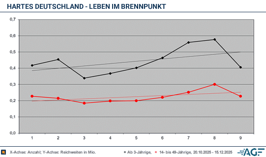 Wer im Folgenden eine Achterbahnbewegung erwartete, der sah sich enttäuscht. Vielmehr war es so, dass man am 17. November eine weitere Liga Abstieg auf triste 3,6 Prozent bei 0,20 Millionen Jüngere. Auch am Gesamtmarkt war das Format zwischenzeitlich weiter abgesunken in die 300.000-Zone.