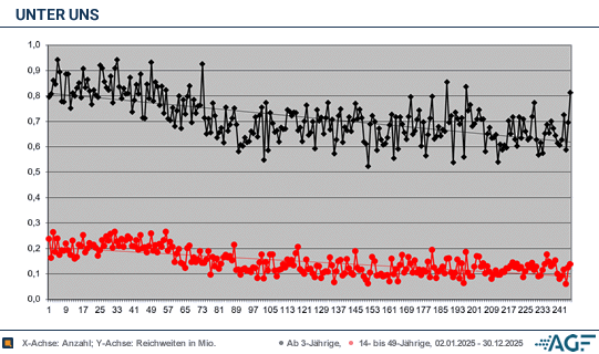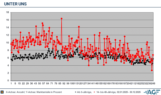 Auch im Dezember hatte die Serie Probleme: Die Reichweiten blieben mit durchschnittlich 0,66 Millionen Zuschauern auf niedrigem Niveau, bei den Umworbenen wurden lediglich 0,12 Millionen erreicht. Bei einem derart geringen Interesse ist der Marktanteil beinahe zweitrangig, da sich das Produkt selbst bei besseren Werten kaum noch refinanzieren lässt.Im Jahr 2025 erreichte «Unter Uns» im Schnitt nur 0,71 Millionen Zuschauer ab drei Jahren, der Marktanteil bewegte sich mit 6,2 Prozent in einem enttäuschenden Bereich. In der Zielgruppe kam die Produktion von UFA Serial Drama lediglich auf 0,15 Millionen Zuschauer und 8,6 Prozent Marktanteil – das ist vor allem im linearen Fernsehen deutlich zu niedrig.