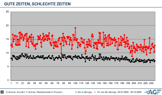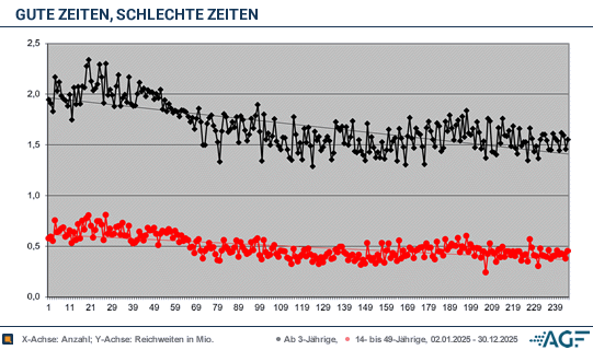 Die Leistungen im November und Dezember 2025 fielen hingegen enttäuschend aus. Das höchste der Gefühle waren 1,68 Millionen Fernsehzuschauer, der Marktanteil lag damals bei 7,6 Prozent. Am 19. November 2025 verbuchte die Serie lediglich 0,45 Millionen junge Zuschauer, was 12,1 Prozent Marktanteil entsprach. Im Jahresdurchschnitt lief «Gute Zeiten, schlechte Zeiten» mit 1,69 Millionen Zuschauern und 8,1 Prozent Marktanteil. Bei den jungen Erwachsenen wurden im Mittel 0,49 Millionen erreicht, was 13,8 Prozent entsprach.