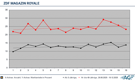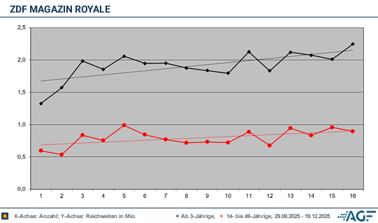Auch die nachfolgenden Wochen waren sehr erfolgreich: Schwangerschaftsabbrüche in Deutschland (1,83 Millionen), die dunkle Seite von Chatbots (2,12 Millionen), russische Desinformation (2,07 Millionen), Lachgas als Droge (2,01 Millionen) und Heilpraktiker (2,25 Millionen) zogen ein großes Publikum an. Bei den Werberelevanten wurden bis zu 0,96 Millionen Zuschauer verbucht, die Marktanteile bei den jungen Menschen lagen zwischen 23,1 und 29,2 Prozent.Im Durchschnitt erreichte das «ZDF Magazin Royale» 1,91 Millionen Fernsehzuschauer ab drei Jahren und lag mit 13,0 Prozent Marktanteil unter dem sehr hohen ZDF-Schnitt. Bei den Zuschauern zwischen 14 und 49 Jahren war die Sendung mit 0,79 Millionen und 24,4 Prozent allerdings ein riesiger Erfolg. Am 28. Februar kehrt die Sendung mit neuen Folgen zurück.