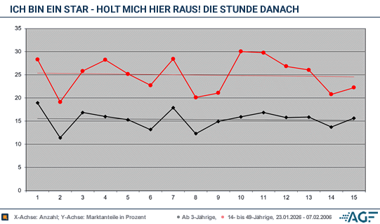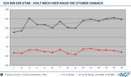 Wie schon beim Dschungel selbst sind die Samstagsfolgen die schwächsten: 2,02 Millionen schalteten ein, der Marktanteil lag bei 12,3 Prozent. Bei den Umworbenen wurden 0,63 Millionen gemessen, das entsprach 20,1 Prozent. Eine Woche vor dem Super Bowl lief keine NFL, weshalb am Sonntag ab 22.30 Uhr wieder Jones und Finger-Erben auf Sendung gingen. 2,00 Millionen Menschen waren dabei, darunter 0,58 Millionen aus der Zielgruppe. Der Marktanteil lag bei 21,1 Prozent.Die zweite Woche legte nochmals deutlich zu: 2,41, 2,48, 2,38 und 2,51 Millionen Zuschauer wurden an den Werktagen gemessen. Am Freitag waren es sogar 2,56 Millionen, am Samstag 2,47 Millionen. Der Höchstwert in der Zielgruppe wurde am zweiten Dienstag mit 0,90 Millionen Umworbenen erzielt. Im Durchschnitt erreichte die Show 2,24 Millionen Fernsehzuschauer und kam auf einen Marktanteil von 15,0 Prozent. Bei den Umworbenen wurden im Mittel 0,74 Millionen gemessen, was starken 24,2 Prozent entsprach.