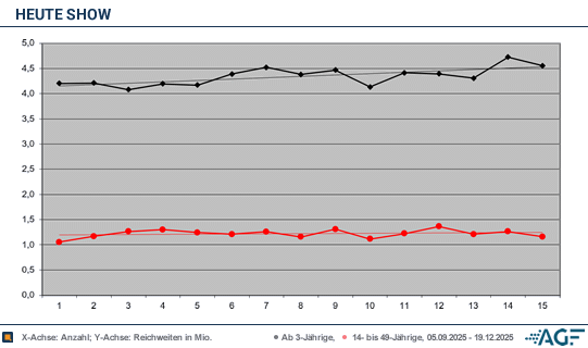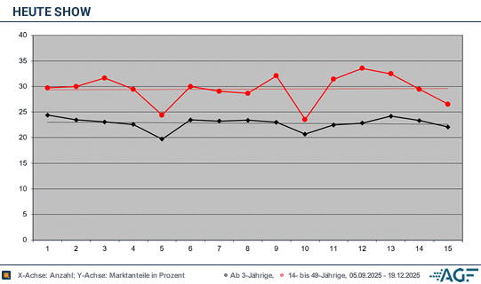 Mit derartigen Sehbeteiligungen langte es am 7. November 2025 schließlich zum vorläufigen Bestwert im betrachteten Zeitraum. Überschwängliche 32,1 Prozent bei 1,31 Millionen 14-49-Jährigen ließen sich erheben. Am Gesamtmarkt waren es 4,47 Millionen zu nicht ganz so extremen, aber dennoch sehr starken 23,0 Prozent.