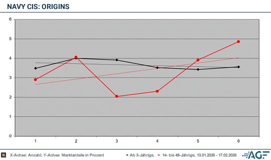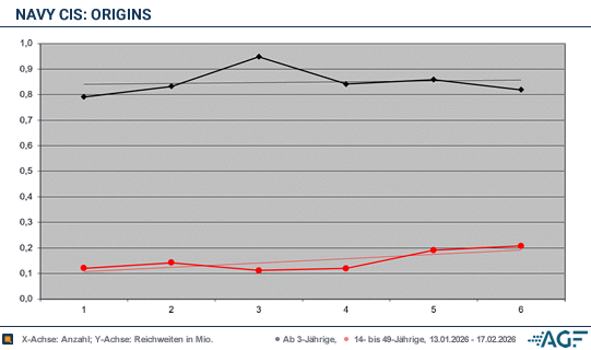Es folgte noch die Episode „Rando“, die am Dienstag, den 17. Februar 2026, um 21.15 Uhr ausgestrahlt wurde. Die größte Überraschung war die Reichweite bei den Umworbenen, die nach dem 20.15-Uhr-Ausflug deutlich stieg: 0,21 Millionen junge Menschen wurden gemessen, der Zielgruppen-Marktanteil lag bei 4,9 Prozent – das ist im Übrigen immer noch schwach. Beim Gesamtpublikum wurden 0,82 Millionen erreicht, der Marktanteil lag bei 3,6 Prozent.«Navy CIS: Origins» läuft bei Sat.1 weiterhin sehr mau. Im Durchschnitt interessierten sich nur 0,85 Millionen Fernsehzuschauer für die Serie – da sind zeitweise Filme aus den 1990er-Jahren bei Kabel Eins erfolgreicher. Der Marktanteil lag bei 3,7 Prozent. Bei den jungen Zusehenden wurden im Schnitt lediglich 0,15 Millionen gemessen, der Marktanteil lag bei schwachen 3,3 Prozent.