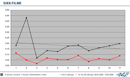 Die Filmstrecke bei sixx am Sonntagabend läuft nur mäßig. In den zweieinhalb Monaten verzeichnete der Frauensender lediglich 0,18 Millionen Fernsehzuschauer, der Marktanteil lag bei 0,7 Prozent. Bei den jungen Erwachsenen wurden 0,06 Millionen gemessen, das führte zu mauen 1,2 Prozent.