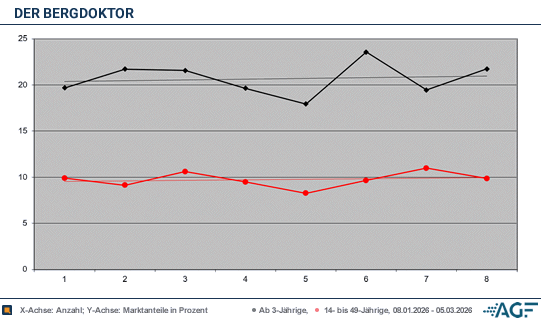 Unter dem Strich verbleiben für die ausgelaufene Staffel vom «Bergdoktor» Durchschnittswerte von weiter sehr erfreulichen 20,7 Prozent (5,12 Millionen) am Gesamtmarkt wie soliden 9,7 Prozent (0,45 Millionen) am Markt der Jüngeren. Teilweise resultierten die Endwerte noch durch einige Nachgewichtungen. Im Jahr zuvor ergaben sich noch etwas höhere Zahlen in Höhe zweistelliger 11,1 Prozent (0,60 Millionen Jüngere) und 20,6 Prozent (5,62 Millionen). Zu erwähnen ist, dass diese Bewegung wohl auch hier mit einer gewissen Verschiebung ins Streaming erklärt werden kann, wo sich die Sigl-Serie zu neuen Rekorden aufschwang. Mit phasenweise über 1,60 Millionen Programm-Marken-Kontakten war sie im VOD-Ranking oft die erfolgreichste fiktionale Produktion.