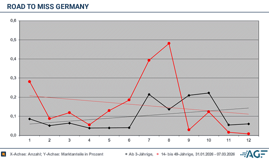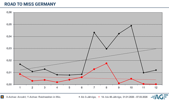 Auch die finale Veranstaltung am Samstag, den 7. März um 20.15 Uhr konnte die verbrannten Kohlen dann nicht mehr aus dem Feuer holen, denn die Relationen verblieben mit 0,2 Prozent durch 0,01 Millionen auf erbärmlichem Niveau. Gleiches lässt sich für die Gesamtzuschauerschaft behaupten, die bei 0,2 Prozent und 0,04 Millionen verharrten.Unter dem Strich stehen für Road to Miss Germany» Mittelwerte von blamablen 0,2 Prozent in der Zielgruppe und ebenfalls völlig desolate 0,2 Prozent am Gesamtmarkt. Zuläufe von 0,01 Millionen wie kaum besseren 0,02 Millionen waren dafür verantwortlich. Am Ende bleibt das Fazit, dass das alles nur noch sehr wenige sehen wollen und der Rahmen eigentlich zu klein ist fürs lineare Fernsehen.