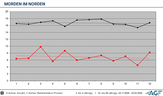 Am Gesamt-Markt gestärkt ging die Krimi-Serie in das Jahr 2026, in dem schon mit der ersten Folge ein vorläufiger Staffelbestwert zustande kam. Am 6. Januar intensivierte sich folglich das Interesse auf richtig erfreuliche 17,6 Prozent durch klasse 3,72 Millionen. Doch das war noch nicht das Ende der Fahnenstange, denn in der darauffolgenden Woche legte man noch ein kleines Quäntchen auf 3,76 Millionen zu und 17,7 Prozent – in Puncto Gesamt-Reichweite war es der letztendliche Staffelrekord. Unauffälliger war zu dieser Zeit die Performance bei den Leuten bis 49, die sich bei ausbaufähigen sechs Prozent bewegten.