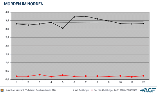 Die Schwankung zurück nahm schließlich nochmal die letzte Folge des Jahres 2025. Konkret wurden an jenem Tag etwas gesunkene 15,7 Prozent am Gesamtmarkt verzeichnet – 3,04 Millionen standen auf der Uhr. Die Jüngeren bewegten sich an diesem Termin auf einem dagegen gestiegenen Level von 8,7 Prozent, die durch etwas verbesserte 0,25 Millionen resultierten.