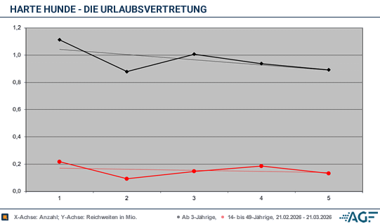 Die erste Folge „Einsatz auf dem Gnadenhof“ wurde auch am 21. Februar 2026 direkt zu Beginn noch einmal gesendet. 1,11 Millionen Menschen sahen Tierschützer Seeger und Steve Staub bei einem außergewöhnlichen Auftrag, bei dem sie auf 75 Tiere aufpassen mussten. Das brachte immerhin 0,22 Millionen aus der Zielgruppe und führte zu starken 6,3 Prozent.