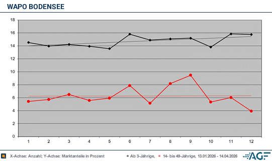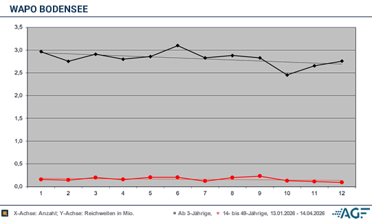 Blick auf die 14-49-Jährigen sah es an diesem Datum mit 0,13 Millionen und 5,3 Prozent schlecht aus. Zum Ende der ersten Staffelhälfte von Runde acht konnte man sich erneut auf bessere 15,9 und 15,8 Prozent optimieren – die Reichweiten stiegen über 2,65 bis 2,76 Millionen am 14. April 2026. Bei den Jüngeren blieb man in Anbetracht 6,0 Prozent (0,11 Millionen) sowie 3,9 Prozent (0,09 Millionen) im verhaltenen bis enttäuschenden Bereich.Im Resümee sind Durchschnittszahlen von ordentlichen 14,7 Prozent (2,82 Millionen) bei den Älteren sowie mittelprächtige 6,3 Prozent (0,16 Millionen) bei den Jüngeren für die erste Hälfte der achten «WaPo Bodensee» Staffel zu nennen. In der Konsequenz lassen sich die Gesamtwerte als zufriedenstellend bezeichnen, wenngleich man nicht ganz an die erfolgreicheren Vorabend-Krimiserien heranreichen kann.