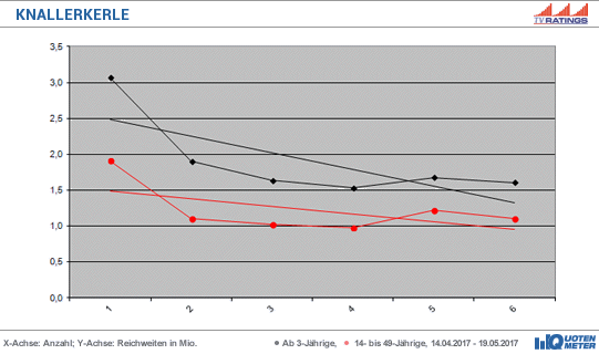 Sieben Tage später ging es ohne solch zugkräftiges Vorprogramm allerdings abwärts. Ab 22.10 Uhr wurden nur noch 1,91 Millionen Interessenten gezählt, 1,11 Millionen der Zuschauer zählten zur werberelevanten Altersgruppe. Dies glich passablen 6,8 Prozent insgesamt, während bei den Jüngeren immerhin tolle 11,0 Prozent erzielt wurden. Am 28. April setzte sich der Abwärtstrend fort: Beim TV-Publikum ab drei Jahren wurden noch 5,9 Prozent herbeigeulkt, indes waren 10,5 Prozent der fernsehenden Umworbenen mit von der Partie. Die Reichweite lag bei 1,60 Millionen Interessenten insgesamt und 0,99 Millionen in der Zielgruppe.
